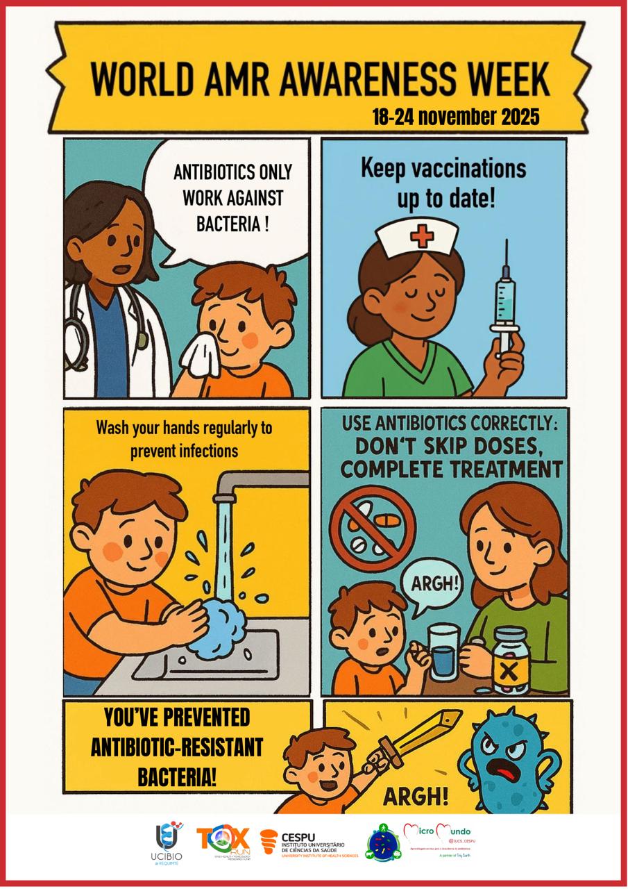 Para divulgar esta mensagem, os nossos estudantes criaram um cartaz e um cartoon educativo, para informar, alertar e sensibilizar sobre uma das maiores ameaças à saúde global: a resistência antimicrobiana.